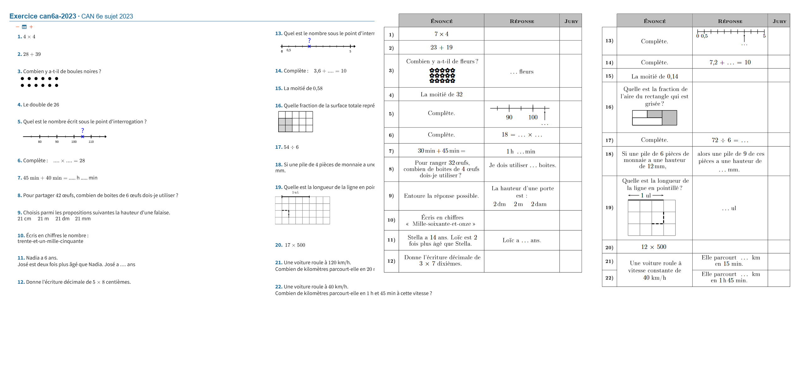 • 30 items de calcul mental ou réfléchi pour chaque niveau. Les 10 premiers items (écrits sur une première colonne) peuvent être  communs pour un cycle donné, les 20 autres répondent aux spécificités des programmes de chaque niveau et le calcul littéral. Les questions ne sont pas dans un ordre de difficulté croissante.