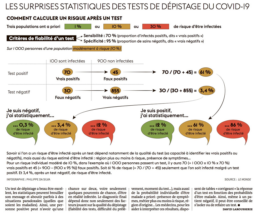 Probabilités et COVID Voici une intéressante infographie parue dans le journal "Le Monde" exploitable au lycée pour faire des probabilités conditionnelles.