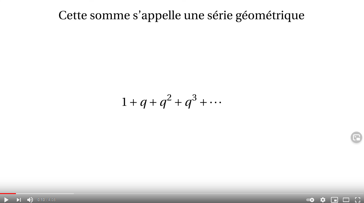 Les séries géométriques sont la somme infinie des puissances d'un même nombre, par exemple 1 + 1/2 + 1/4 + 1/8 +... Bien qu'il y ait une infinité de termes, ces sommes donnent parfois un nombre bel et bien fini. Vous allez découvrir dans cette vidéo comment calculer ces sommes sans faire (presque) aucun calcul.
