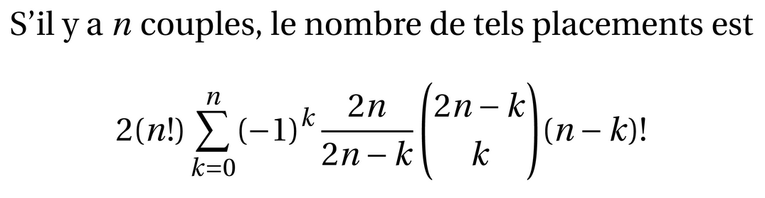 Le problème des ménages est un problème consistant à trouver le nombre de façons de placer des couples autour d’une table de façon à alterner hommes et femmes et à ne placer personne à côté de son (sa) conjoint(e).